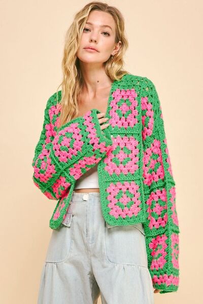 A two-tone flower square crochet open front cardigan is a beautiful and versatile piece that combines a trendy design with intricate crochet work. The two-tone color scheme adds visual interest, while the flower square pattern provides a charming and feminine touch. This open-front cardigan is perfect for layering over a simple top or dress to add a bohemian flair to your outfit. It's a great choice for adding a stylish and handmade look to your wardrobe, whether you're heading to a casual outing or a special occasion.